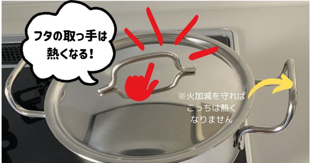 熱くならないのは「本体の取っ手」です。フタの取っ手も熱くならないかと思ってたら大間違いよ?マジでむちゃくちゃ熱いから気をつけて?絶対にミトン必須です。