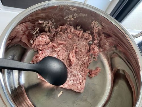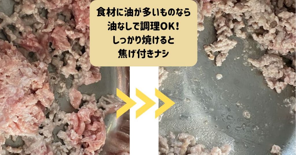 余熱が終了したのでひき肉をラップから投入しようとしたら、失敗して鍋肌にひっつきまくりました。涙 ま、この後どれくらいこびりついたり、ちゃんと汚れが落ちるのかも合わせてご覧ください。