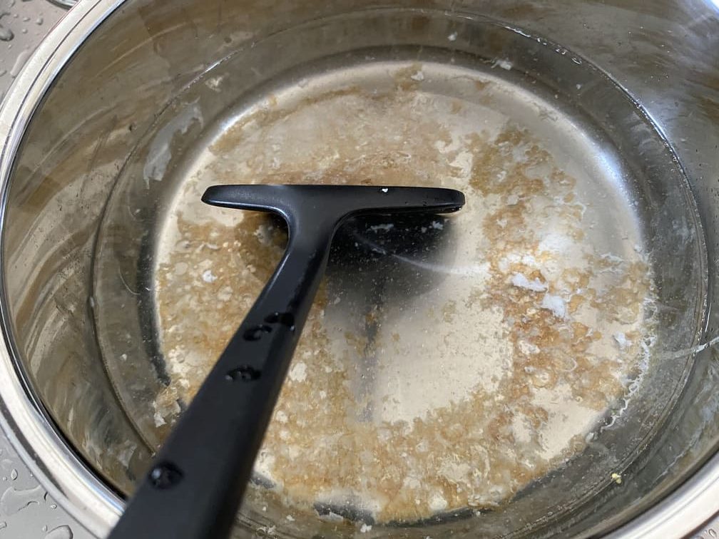 もし焦がしてしまった場合も、よっぽど酷いものなら重曹を入れて煮立たせた後に、スポンジでこする。もしくはクレンザーを使って落とせます。
