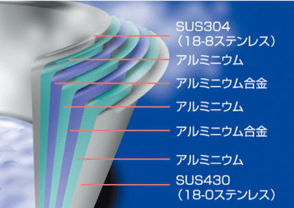 ステンレスはサビにくく丈夫で傷つきにくいのですが、熱伝導率が悪い。そのため熱伝導率が良いアルミニウムを中に挟み込み、オールステンレスのものよりも軽く、加熱に時間がかからない(=光熱費が抑えられる!)という仕様に。