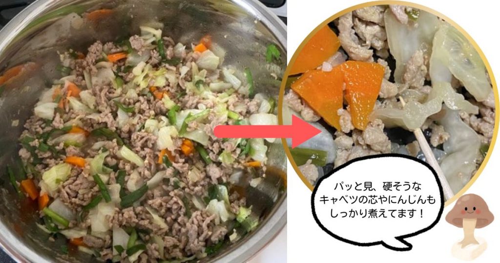 その後、野菜を投入してフタをし「蒸し煮」に。味付けをして沸騰したら「余熱調理」。クタクタにはならず、形を保ったままちゃんと中まで火が通ってます。