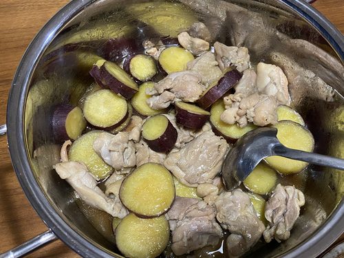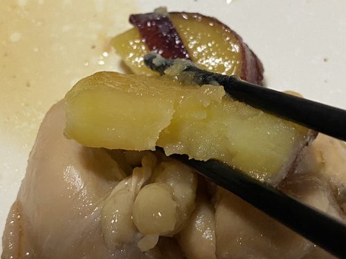 たったの10分煮たあと、1時間余熱調理した鶏肉とさつまいもの煮物。醤油とみりんのこってりとしたタレがさつまいもにこれでもか、としみ込んでました。ぜひ「余熱調理」の魅力を味わってみて欲しいです。