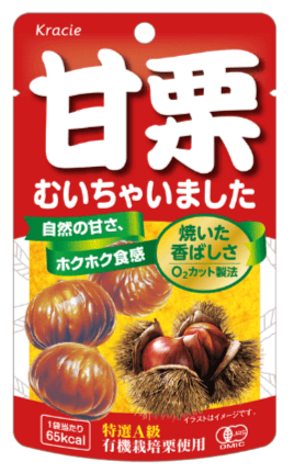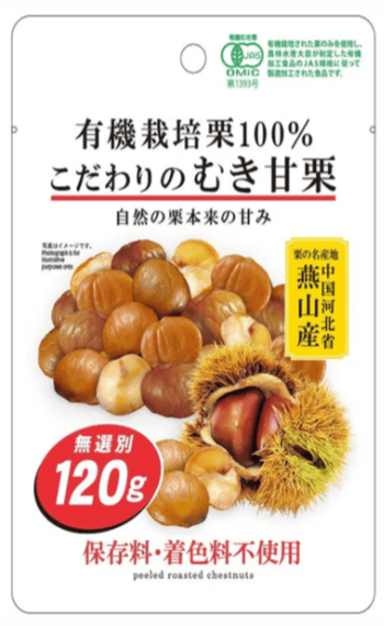 中国産を嫌う消費者のため(?)有機栽培栗を使用しているメーカーが多数。こちらの「甘栗むいちゃいました」も、3年以上農薬や化学肥料を使用していない有機JAS認証を受けた農場で栽培されています。