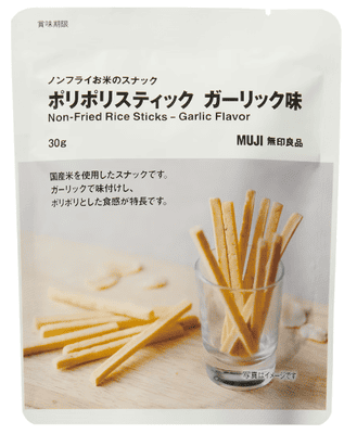 国産米を使用したポリポリ食感が楽しいスナック。ノンフライですが、生地には油が練りこまれています。味は2種類あり、フライドガーリックとブラックペッパー、どちらも大人向けのパンチの効いたフレーバーです。