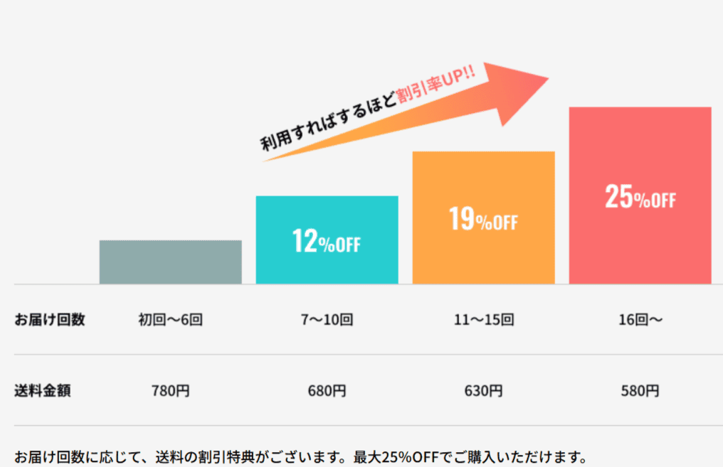 2025年4月より、お届け回数に応じて送料の割引特典があります。利用すればするほどお得!最大で25%オフです。